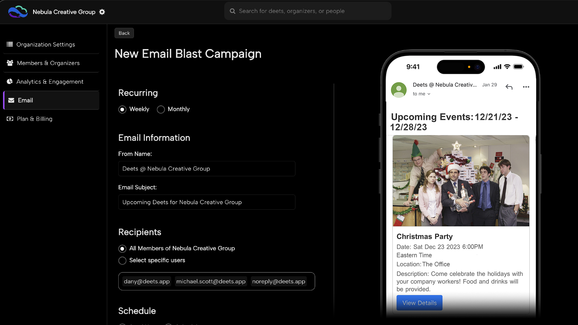 Weekly and monthly "what's coming up" emails — built and sent automatically to your members. No copywriting, no separate email tool, no forgetting to hit send.